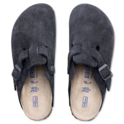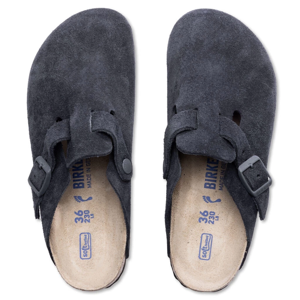 Birkenstock introduces the Womenâs Boston Soft Footbed. Taking on a classic suede upper, the silhouette utilizes a slip-on design along with a suede footbed lining for added comfort. The adjustable strap features a metal pin buckle for further dimension. The EVA sole is flexible and lightweight for a finishing touch.