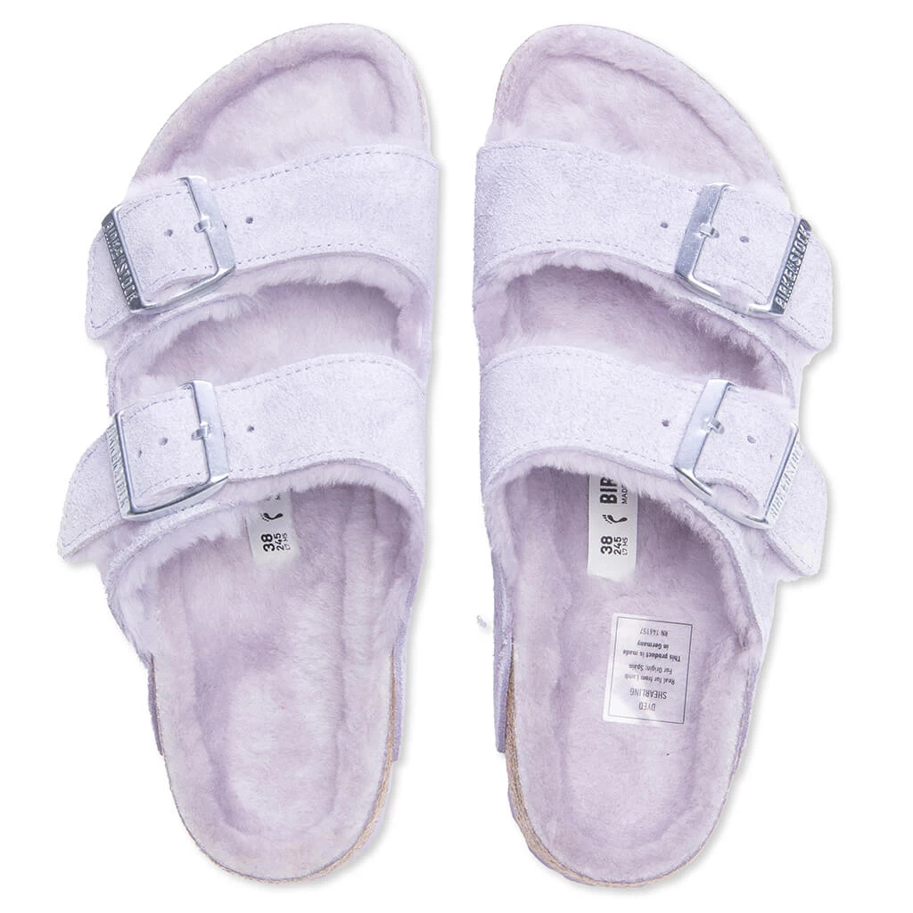 Perfect for chilly evenings, the Birkenstock Womenâs Narrow Arizona Shearling features the classic anatomically-shaped cork-latex footbed along with suede straps. The footbed lining comprises genuine shearling, while the two straps include adjustable metal pin buckles. The EVA outsole underneath protects the design.