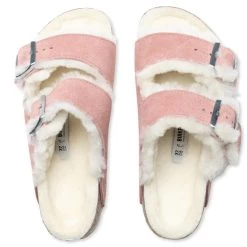 Perfect for chilly evenings, the Birkenstock Womenâs Wide Arizona Shearling features the classic anatomically-shaped cork-latex footbed along with suede straps. The footbed lining comprises genuine shearling, while the two straps include adjustable metal pin buckles. The EVA outsole underneath protects the design.